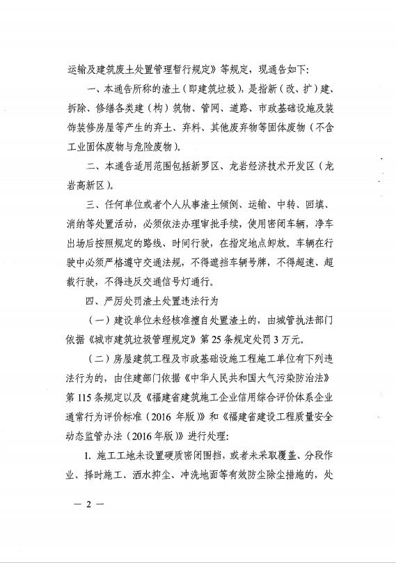 龍巖市人民政府關(guān)于嚴(yán)厲打擊渣土處置違法行為的通告(通告【2017】3號(hào))