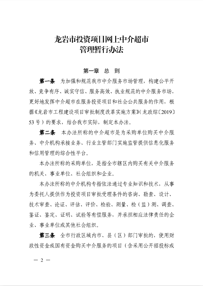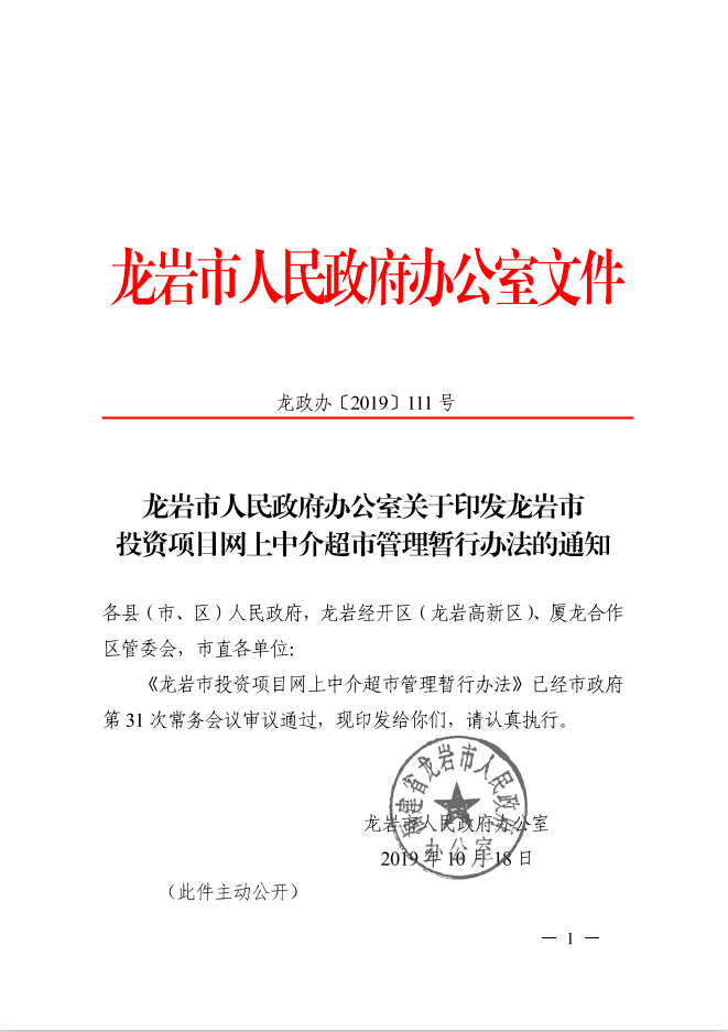 龍巖市人民政府辦公室關(guān)于印發(fā)龍巖市投資項目網(wǎng)上中介超市管理暫行辦法的通知(龍政辦[2019]111號)